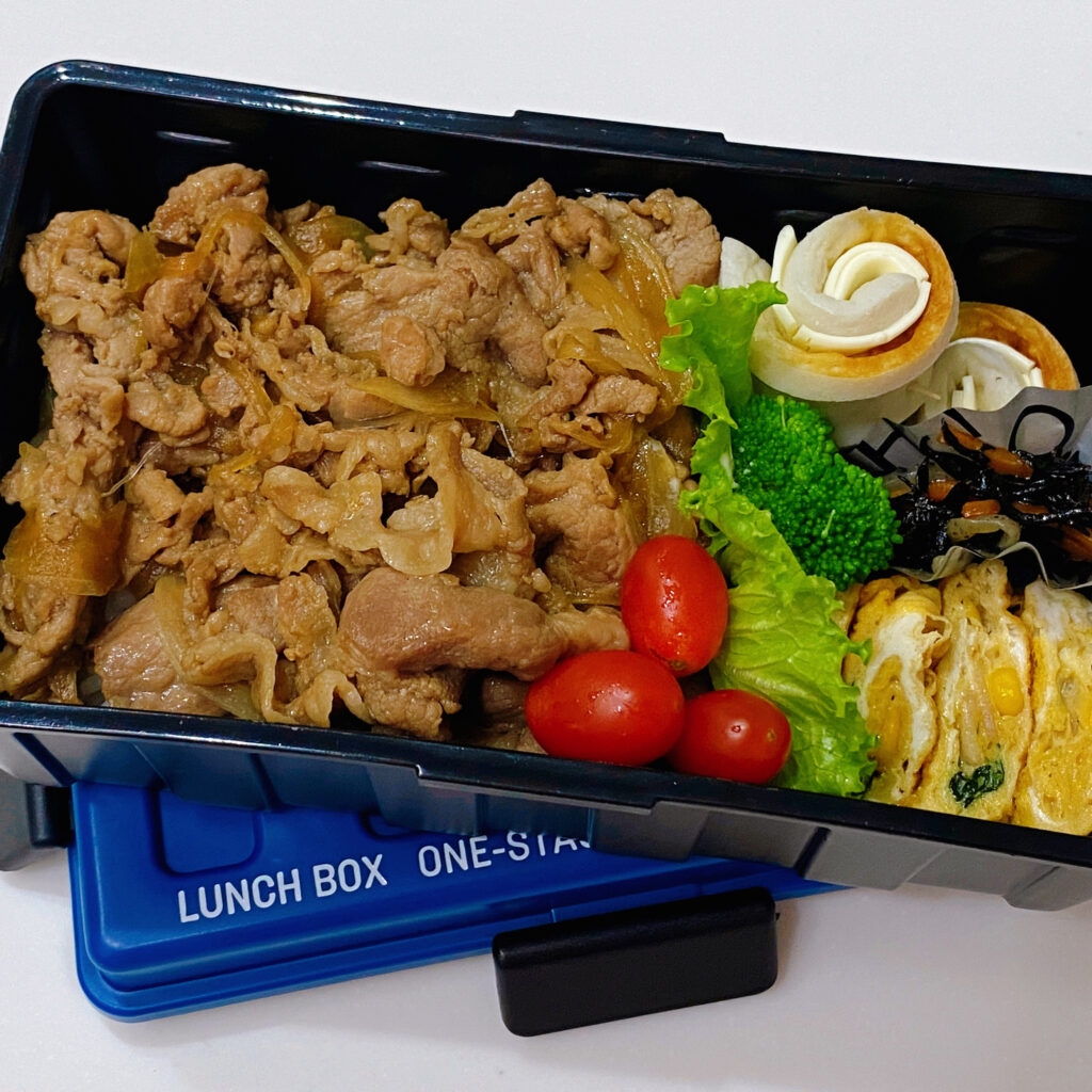 メインのおかずは豚肉と玉ねぎを醤油と生姜で炒めたものでした。
